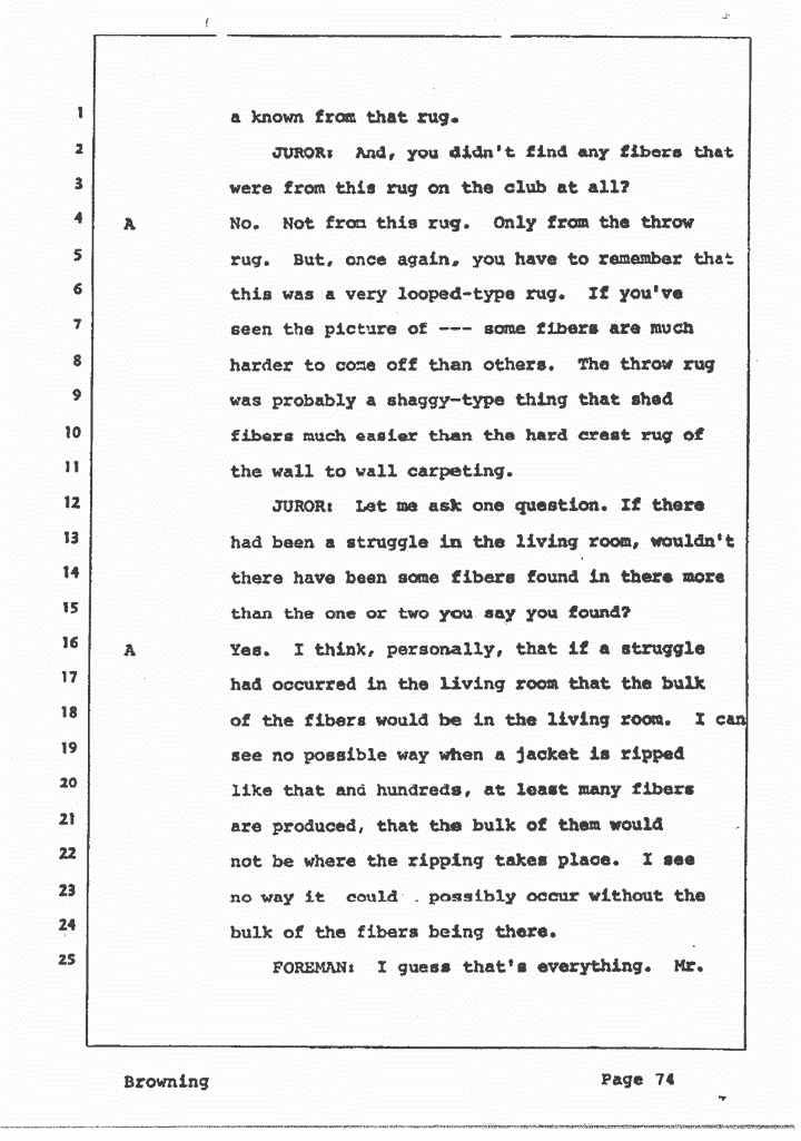 JUROR: Let me ask one question. If there had been a struggle in the living room, wouldn't there have been some fibers found in there, more than the one or two you say you found?