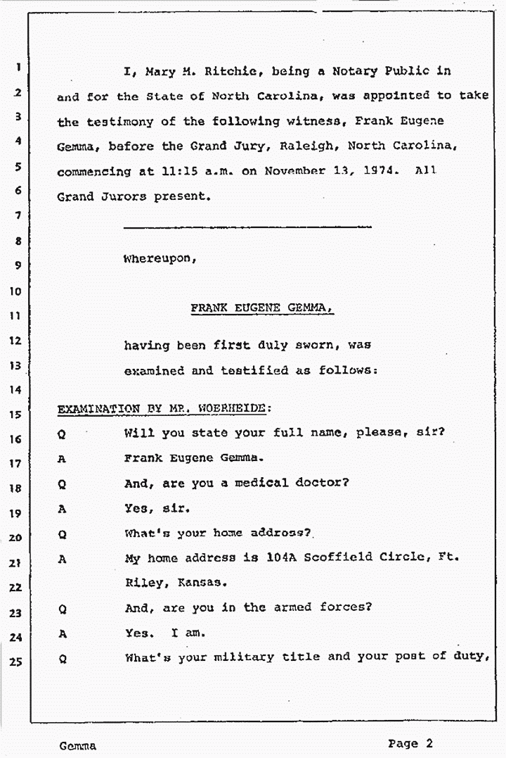 I, Mary M. Ritchie, being a Notary Public in and for the State of North Carolina, was appointed to take the testimony of the following witness, Frank Eugene Gemma, before the Grand Jury, Raleigh, North Carolina, commencing at 11:15 a.m. on November 13, 1974. All Grand Jurors present.
