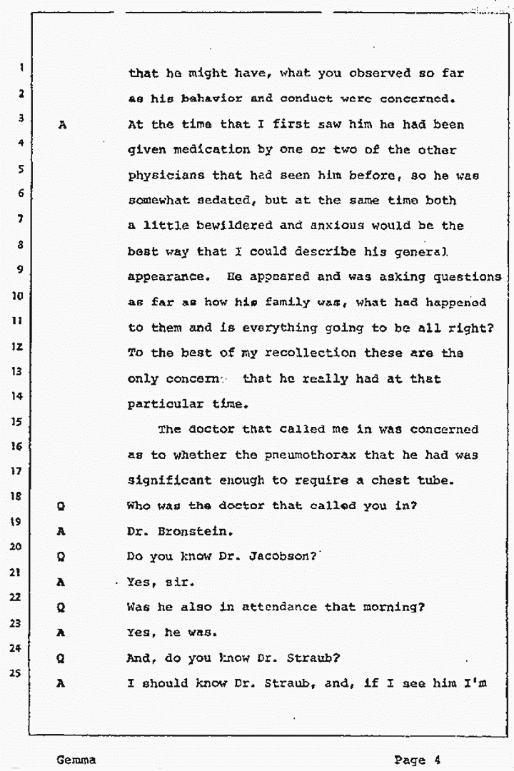 A No. I don't remember. In fact, I'd probably made a conscientious effort to avoid discussing this with him. Dr. Bronstein had briefed me on the way to the intensive care ward as to what had happened to his knowledge and that Dr. MacDonald did not know that his wife and children were, in fact, dead. So the question in our minds were when to tell him definitely that they were no longer alive. So we tried to concentrate on his condition rather than get involved with how his family was.