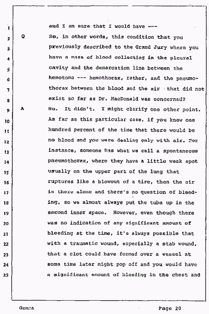Q So, in other words, this condition that you previously described to the Grand Jury where you have a mass of blood collecting in the pleural cavity and the demarcation line between the hematoma -- hemothorax, rather, and the pneumothorax between the blood and the air, that did not exist so far as Dr. MacDonald was concerned?