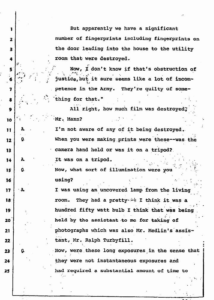A I was using an uncovered lamp from the living room. They had a pretty -- I think it was a hundred fifty watt bulb I think that was being held by the assistant to me for taking of photographs which was also Mr. Medlins's assistant, Mr. Ralph Turbyfill.