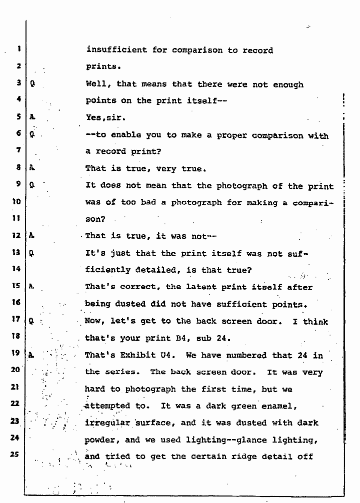 A That's Exhibit U4. We have numbered that 24 in the series. The back screen door. It was very hard to photograph the first time, but we attempted to. It was a dark green enamel, irregular surface, and it was dusted with dark powder, and we used lighting -- glance lighting, and tried to get the certain ridge detail off of it.