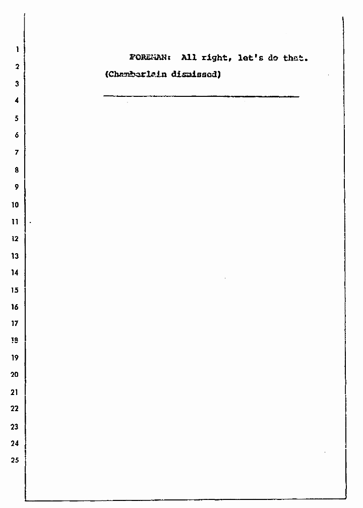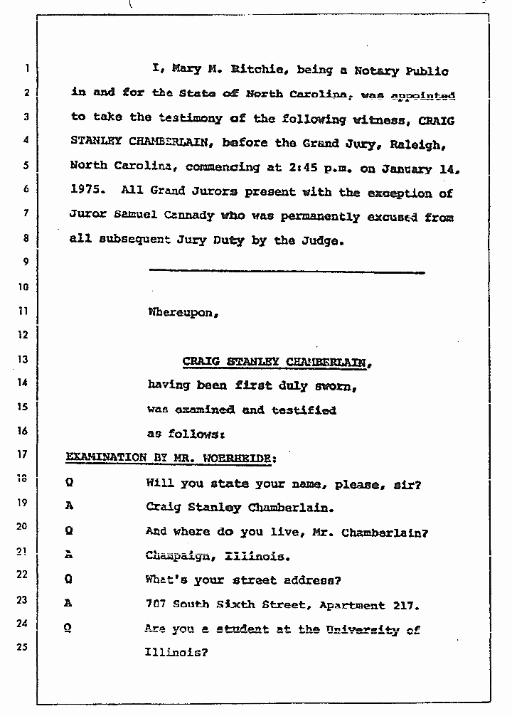 I, Mary M. Ritchie, being a Notary Public in and for the State of North Carolina, was appointed to take the testimony of the following witness, CRAIG STANLEY CHAMBERLAIN, before the Grand Jury, Raleigh, North Carolina, commencing at 2:45 p.m. on January 14, 1975. All Grand Jurors present with the exception of Juror Samuel Cannady who was permanently excused from all subsequent Jury Duty by the Judge.