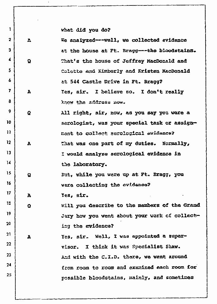 A We analyzed -- well, we collected evidence at the house at Ft. Bragg -- the bloodstains.