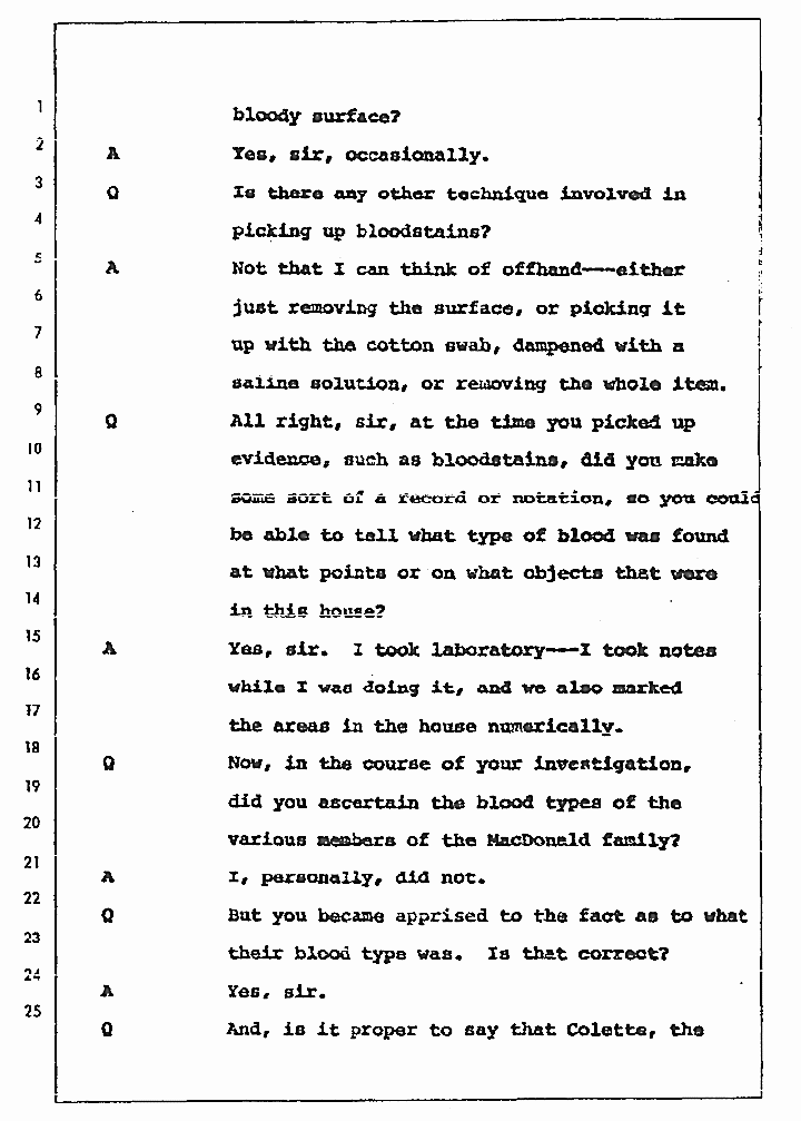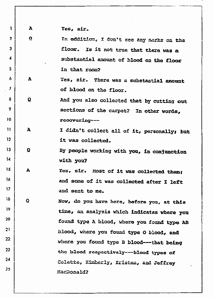 Q Now, do you have here, before you, at this time, an analysis which indicates where you found type A blood, where you found type AB blood, where you found type O blood, and where you found type B blood -- that being the blood respectively -- blood types of Colette, Kimberly, Kristen, and Jeffrey MacDonald?