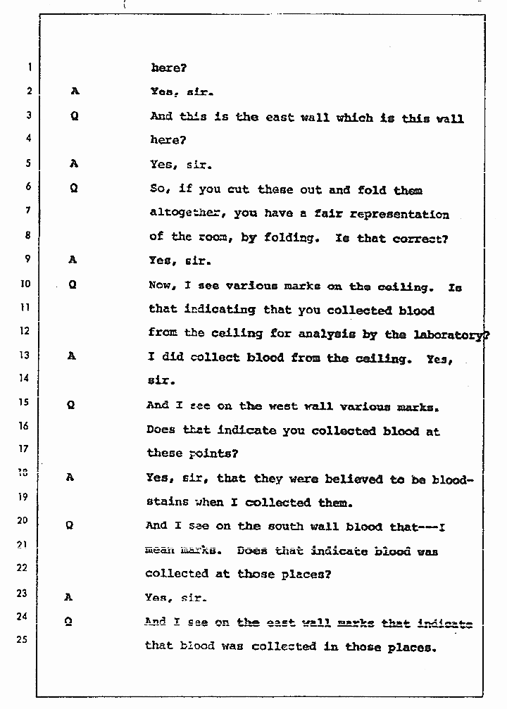 Q Now, I see various marks on the ceiling. Is that indicating that you collected blood from the ceiling for analysis by the laboratory?