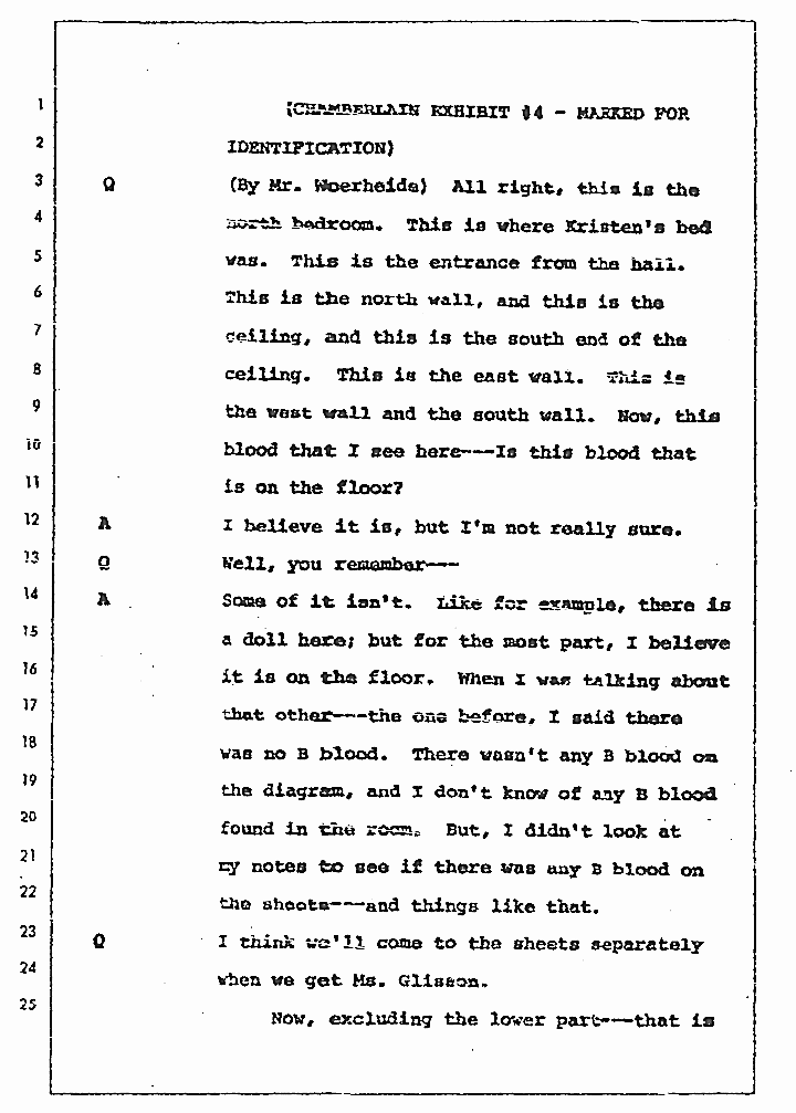 A Some of it isn't. Like for example, there is a doll here; but for the most part, I believe it is on the floor. When I was talking about that other -- the one before, I said there was no B blood. There wasn't any B blood on the diagram, and I don't know of any B blood found in the room. But, I didn't look at my notes to see if there was any B blood on the sheets -- and things like that.