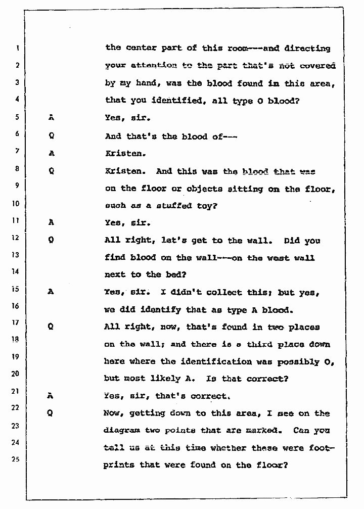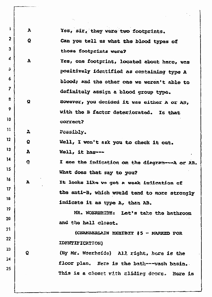 A Yes, one footprint, located about here, was positively identified as containing type A blood; and the other one we weren't able to definitely assign a blood group type.
