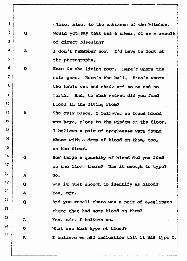 A The only place, I believe, we found blood was here, close to the window on the floor. I believe a pair of eyeglasses were found there with a drop of blood on them, too, on the floor.