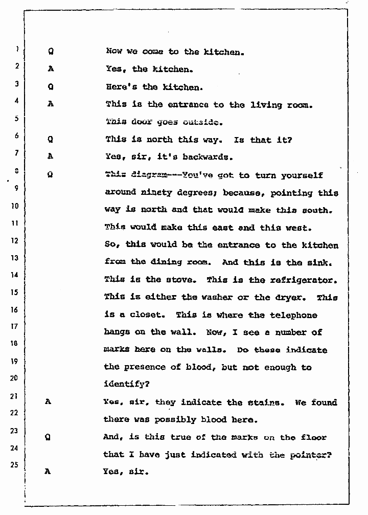 Q Here is the living room. Here's where the sofa goes. Here's the hall. Here's where the table was and chair and so on and so forth. And, to what extent did you find blood in the living room?