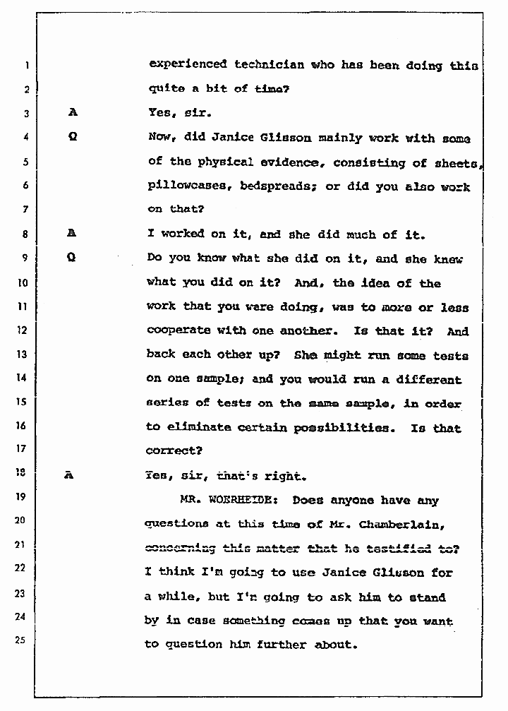 Q Now, did Janice Glisson mainly work with some of the physical evidence, consisting of sheets, pillowcases, bedspreads; or did you also work on that?
