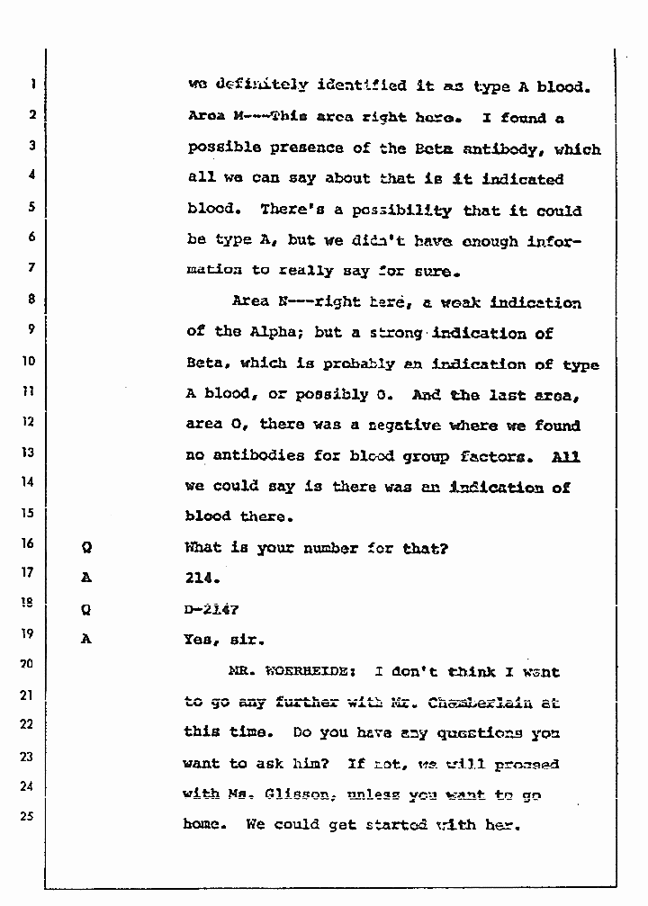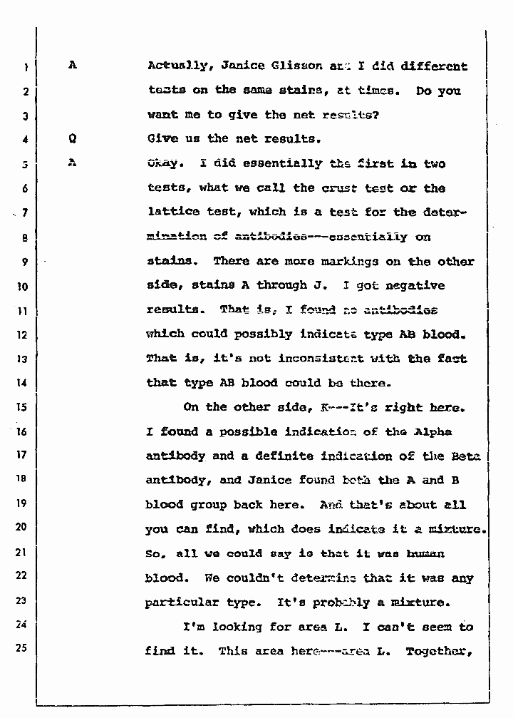 A Okay. I did essentially the first in two tests, what we call the crust test or the lattice test, which is a test for the determination of antibodies -- essentially on stains. There are more markings on the other side, stains A through J. I got negative results. That is, I found no antibodies which could possibly indicate type AB blood. That is, it's not inconsistent with the fact that type AB blood could be there.