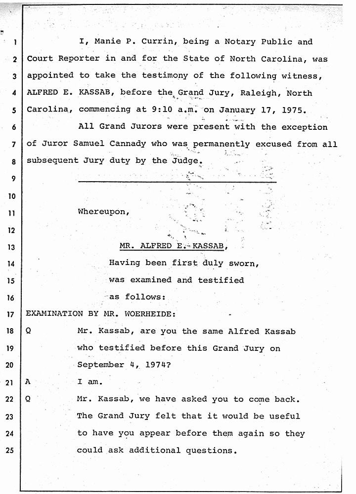 I, Manie P. Currin, being a Notary Public and Court Reporter in and for the State of North Carolina, was appointed to take the testimony of the following witness, ALFRED E. KASSAB, before the Grand Jury, Raleigh, North Carolina, commencing at 9:10 a.m. on January 17, 1975. All Grand Jurors were present with the exception of Juror Samuel Cannady who was permanently excused from all subsequent Jury duty by the Judge.