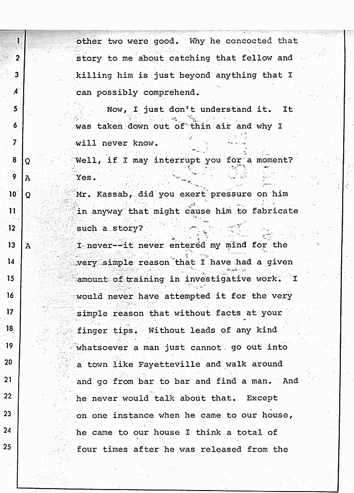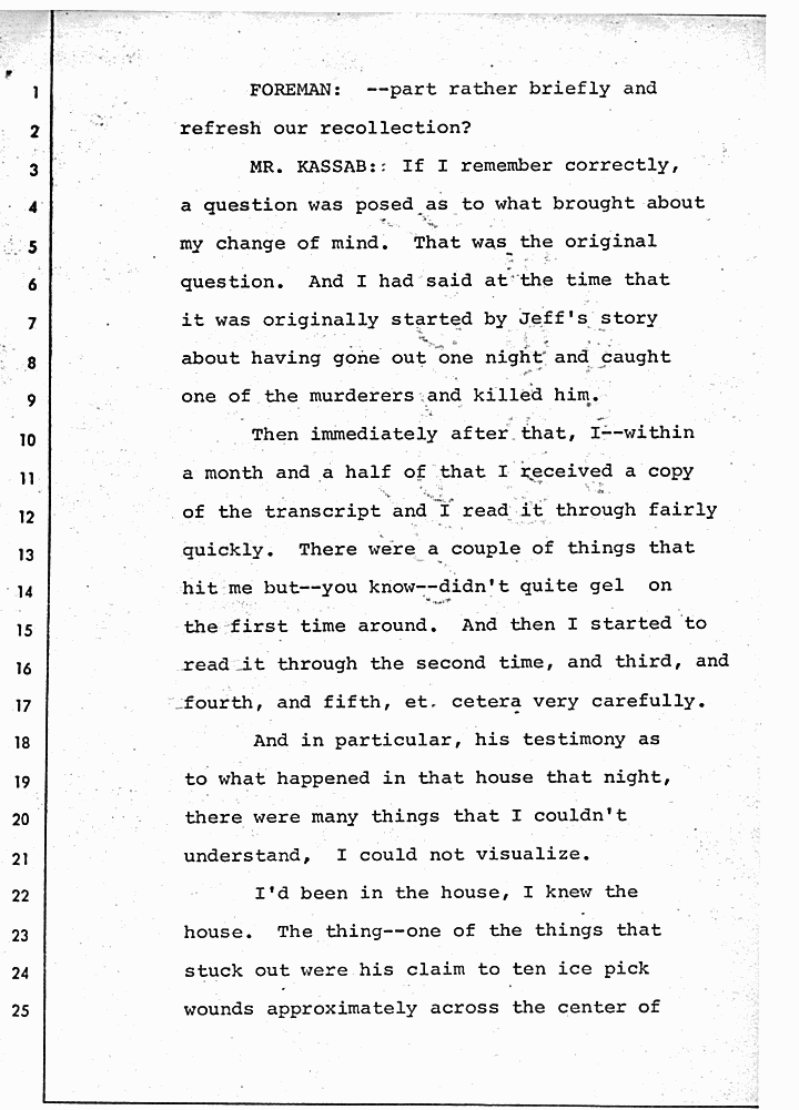 MR. KASSAB: If I remember correctly, a question was posed as to what brought about my change of mind. That was the original question. And I had said at the time that it was originally started by Jeff's story about having gone out one night and caught one of the murderers and killed him.