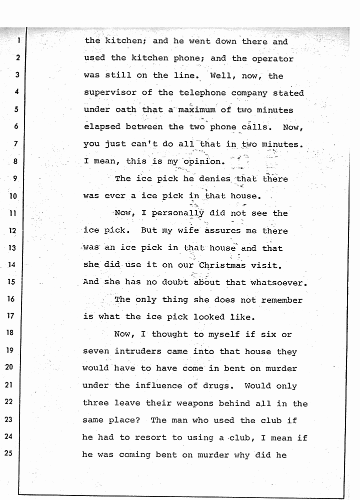 Jeff's claim of having made that first phone call to the police, he stated that after he had made the first phone call and he dropped it because he didn't think he was getting the right answers; and then he went and he examined Colette; he went possibly and looked out the back door; then he proceeded and examined both Kimmy and Kristy in turn; and possibly gave one or both of them artificial respiration as well as taking their pulses; and then he went out into the hall and he was dazed and didn't know what to do; and then he remembered he had another phone in the kitchen; and he went down there and used the kitchen phone; and the operator was still on the line. Well, now, the supervisor of the telephone company stated under oath that a maximum of two minutes elapsed between the two phone calls. Now, you just -- can't do all that in two minutes. I mean, this is my opinion.