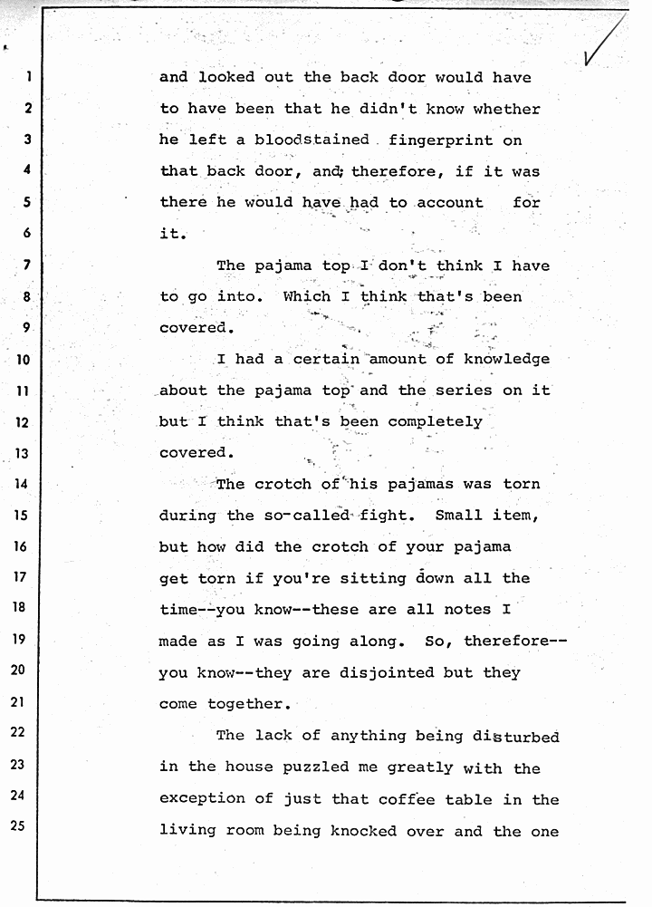 The crotch of his pajamas was torn during the so-called fight. Small item, but how did the crotch of your pajama get torn if you're sitting down all the time -- you know -- these are all notes I made as I was going along. So, therefore -- you know -- they are disjointed but they come together.