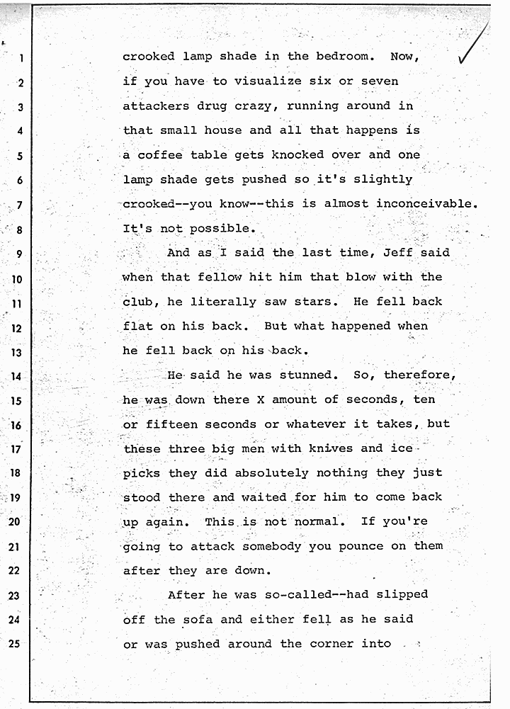 The lack of anything being disturbed in the house puzzled me greatly with the exception of just that coffee table in the living room being knocked over and the one crooked lamp shade in the bedroom. Now, if you have to visualize six or seven attackers drug crazy, running around in that small house and all that happens is a coffee table gets knocked over and one lamp shade gets pushed so it's slightly crooked -- you know -- this is almost inconceivable. It's not possible.