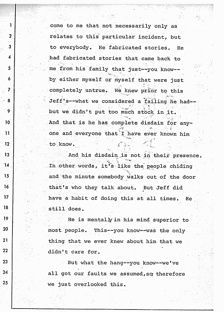 He has told so many lies that it has come to me that not necessarily only as relates to this particular incident, but to everybody. He fabricated stories. He had fabricated stories that came back to me from his family that just -- you know -- by either myself or myself that were just completely untrue. We knew prior to this Jeff's -- what we considered a failing he had -- but we didn't put too much stock in it. And that is he has complete disdain for anyone and everyone that I have ever known him to know.
