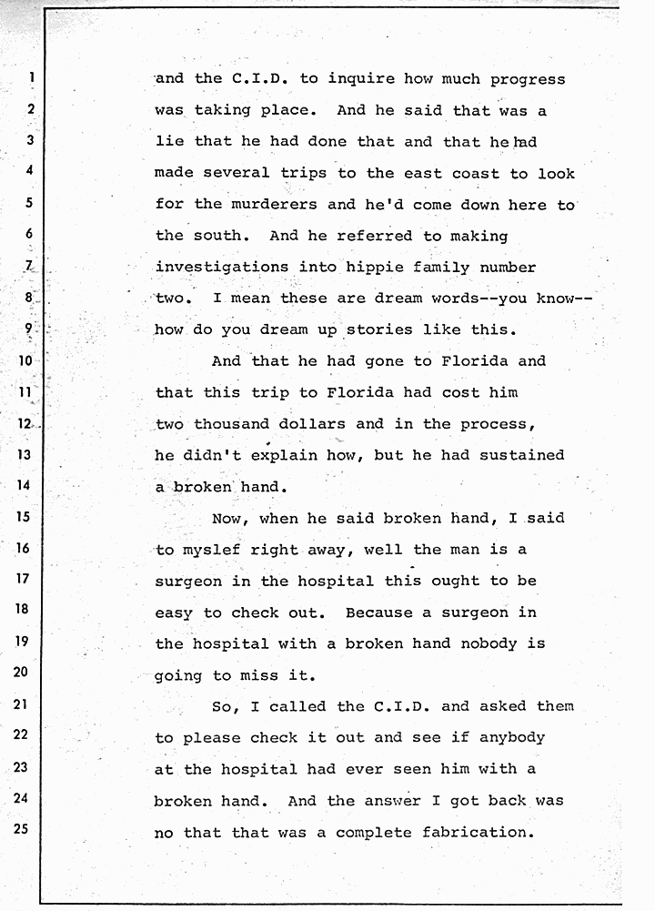 But in a further letter possibly a year later from California he states angrily when I accused him of not going to the C.I.D. or the F.B.I. for information that is the only thing that I chastised him about. Not being interested enough to go to the F.B.I. and the C.I.D. to inquire how much progress was taking place. And he said that was a lie that he had done that and that he had made several trips to the east coast to look for the murderers and he'd come down here to the south. And he referred to making investigations into hippie family number two. I mean these are dream words -- you know -- how do you dream up stories like this.