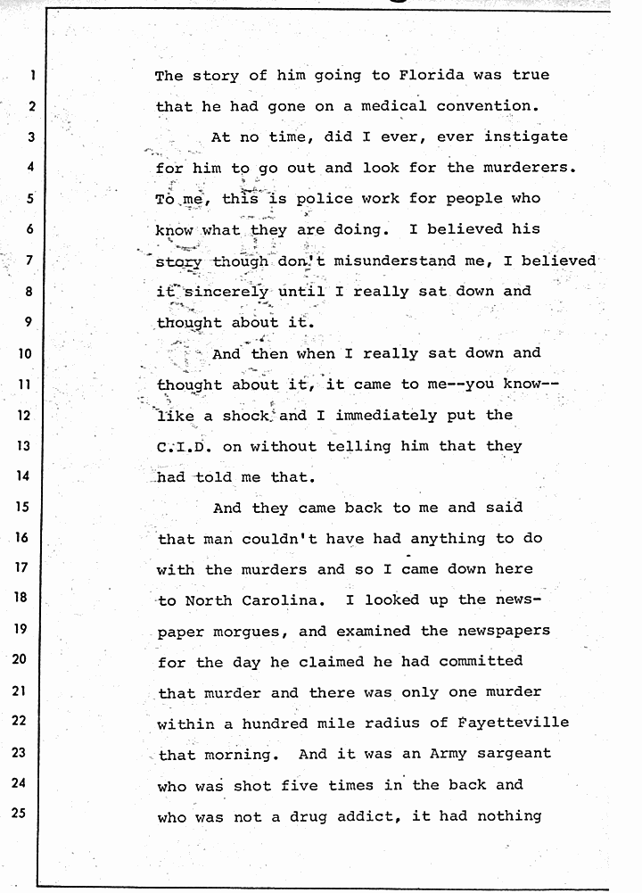 And they came back to me and said that man couldn't have had anything to do with the murders and so I came down here to North Carolina. I looked up the newspaper morgues, and examined the newspapers for the day he claimed he had committed that murder and there was only one murder within a hundred mile radius of Fayetteville that morning. And it was an Army sergeant who was shot five times in the back and who was not a drug addict; it had nothing to do with drugs.