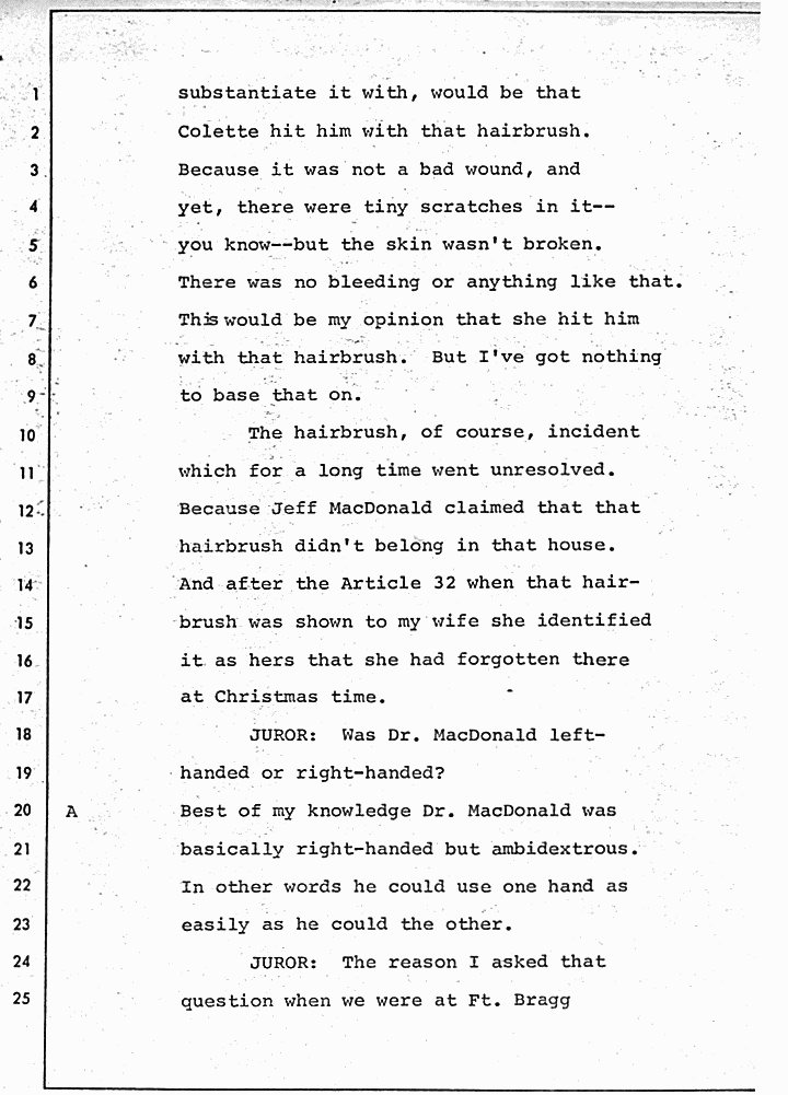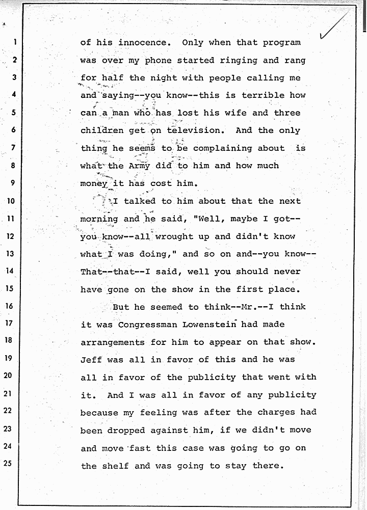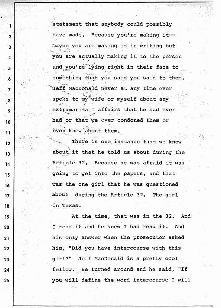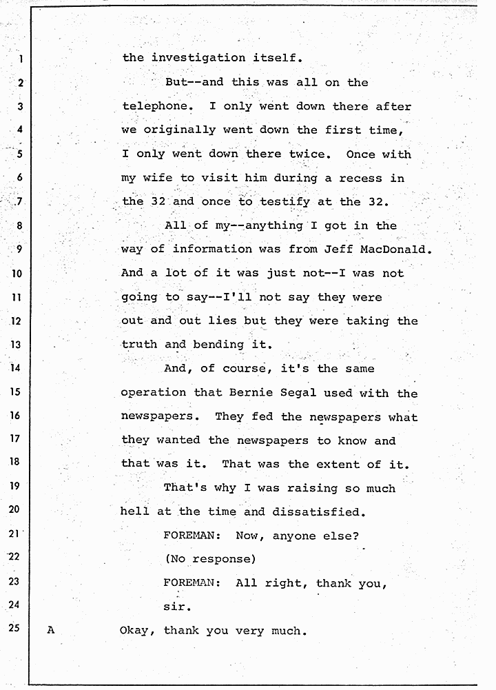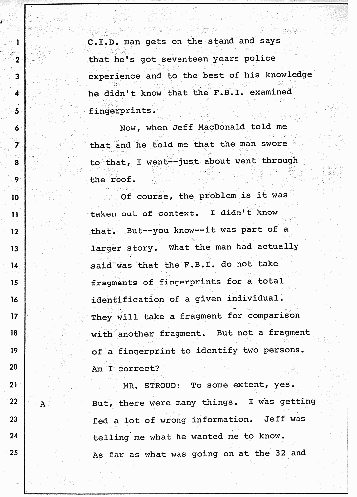 I was being told a given amount of things by Jeff MacDonald that just sent me right through the roof. Not directly concerned with the murders but -- you know -- as I said I called him every night on the phone. And I mean I get stories like a C.I.D. man gets on the stand and says that he's got seventeen years police experience and to the best of his knowledge he didn't know that the F.B.I. examined fingerprints.