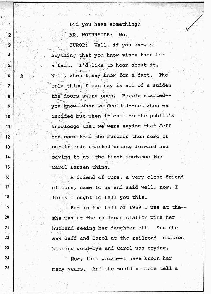 JUROR: Well, as far as you know, did Jeff associate with that type of people when he was in your vicinity or wherever vou may have known him?