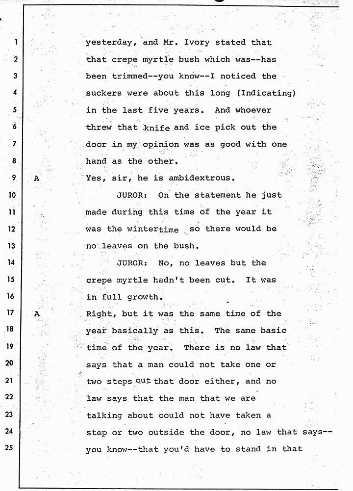 JUROR: No, no leaves but the crepe myrtle hadn't been cut. It was in full growth.
