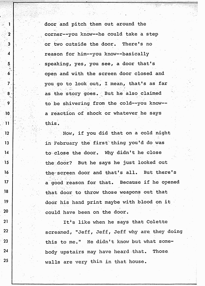 Now, if you did that on a cold night in February the first thing you'd do was to close the door. Why didn't he close the door? But he says he just looked out the screen door and that's all. But there's a good reason for that. Because if he opened that door to throw those weapons out that door his hand print maybe with blood on it could have been on the door.