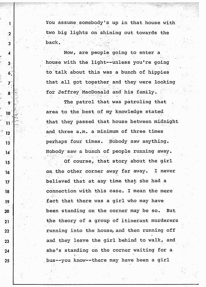 Now, are people going to enter a house with the light -- unless you're going to talk about this was a bunch of hippies that all got together and they were looking for Jeffrey MacDonald and his family.