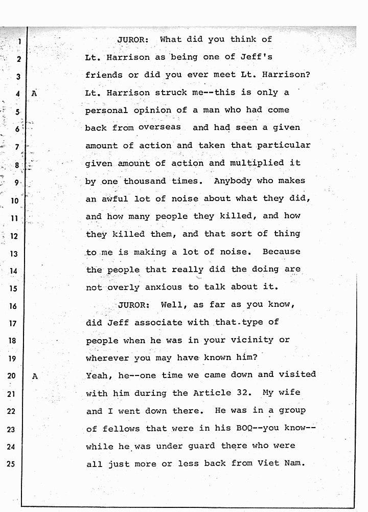 JUROR: What did you think of Lt. Harrison as being one of Jeff's friends or did you ever meet Lt. Harrison?