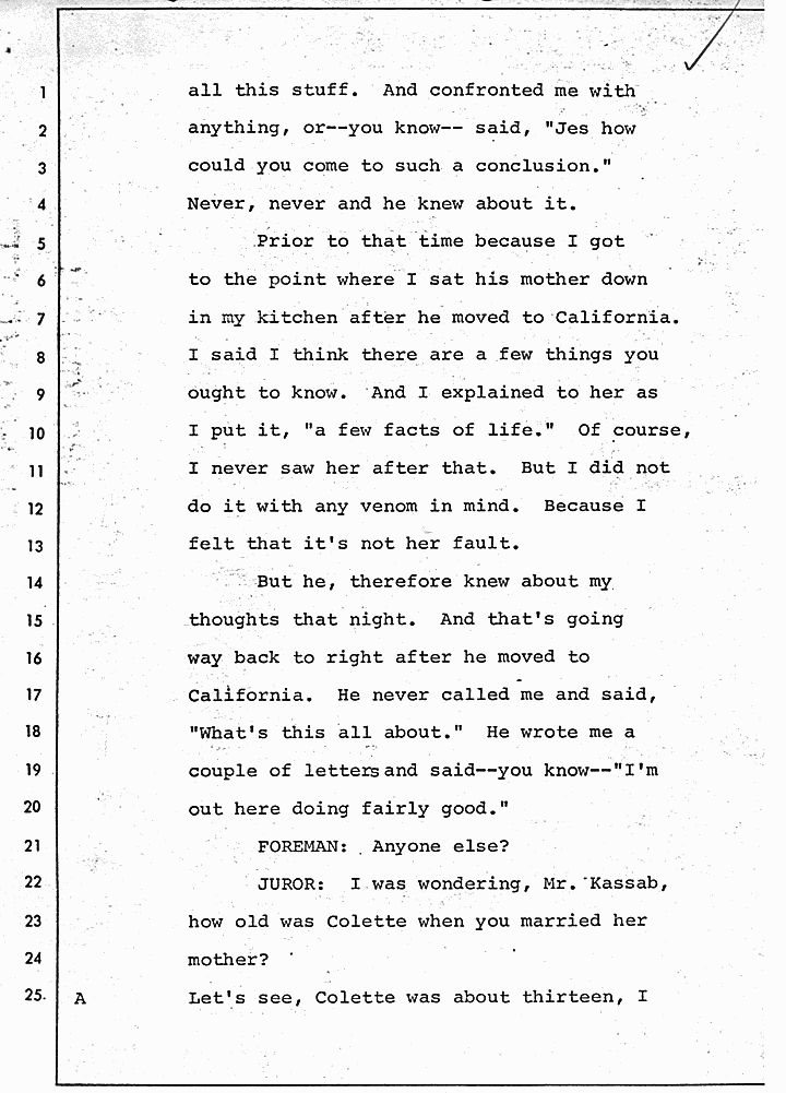JUROR: I was wondering, Mr. Kassab, how old was Colette when you married her mother?