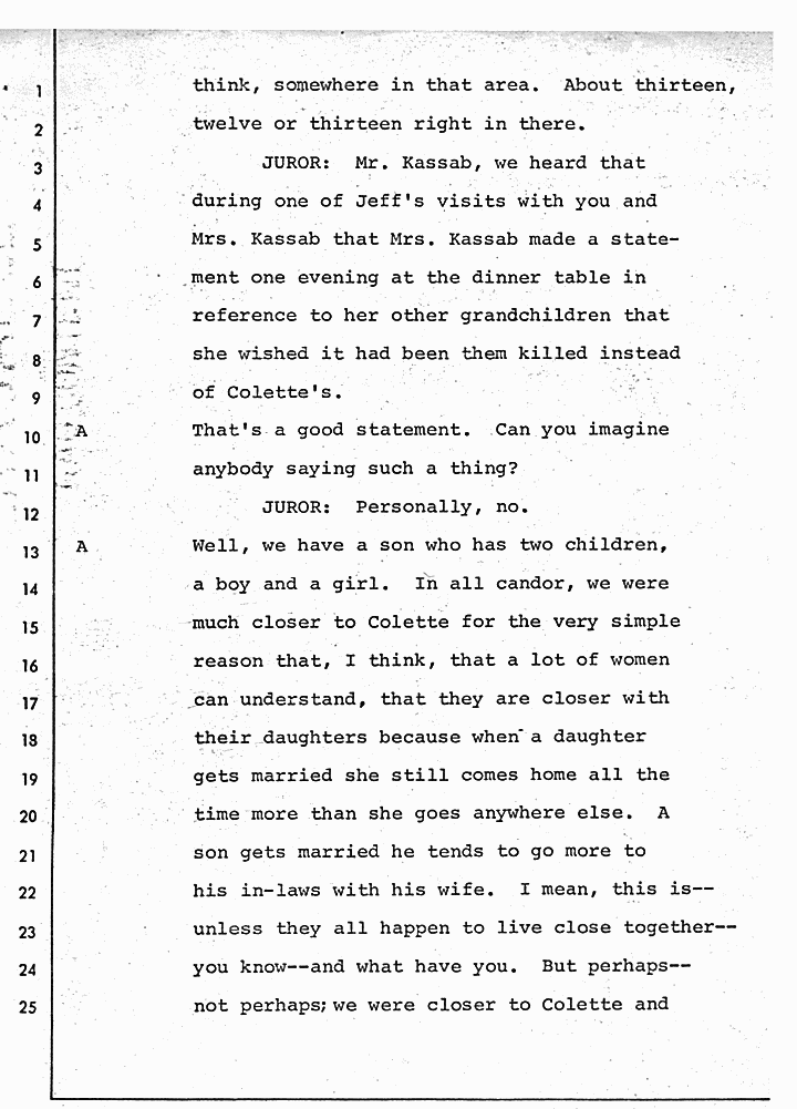 JUROR: Mr. Kassab, we heard that during one of Jeff's visits with you and Mrs. Kassab that Mrs. Kassab made a statement one evening at the dinner table in reference to her other grandchildren that she wished it had been them killed instead of Colette's.