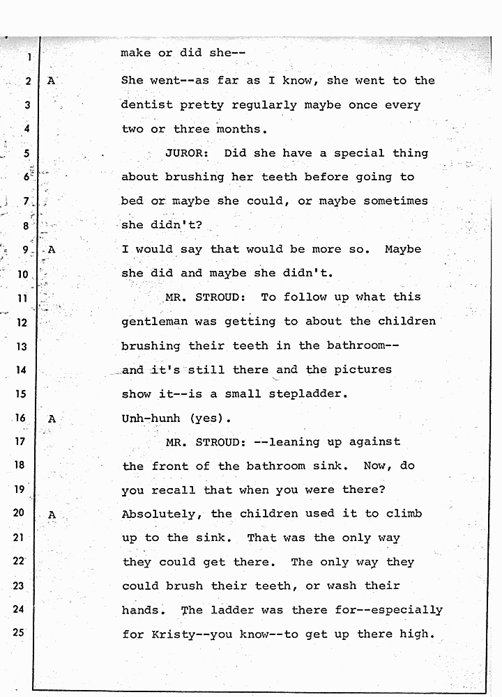 JUROR: Did she have a special thing about brushing her teeth before going to bed or maybe she could, or maybe sometimes she didn't?