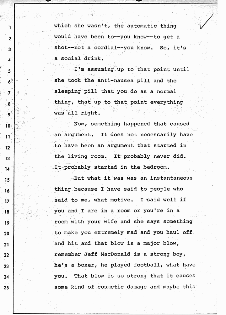 But what it was was an instantaneous thing because I have said to people who said to me, what motive. I said well if you and I are in a room or you're in a room with your wife and she says something to make you extremely mad and you haul off and hit and that blow is a major blow, remember Jeff MacDonald is a strong boy, he's a boxer, he played football, what have you. That blow is so strong that it causes some kind of cosmetic damage and maybe this is more than one blow; maybe there's two or three.