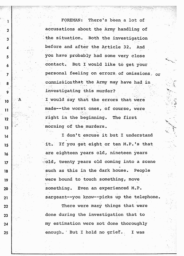 FOREMAN: There's been a lot of accusations about the Army handling of the situation. Both the investigation before and after the Article 32. And you have probably had some very close contact. But I would like to get your personal feeling on errors of omissions or commission that the Army may have had in investigating this murder?