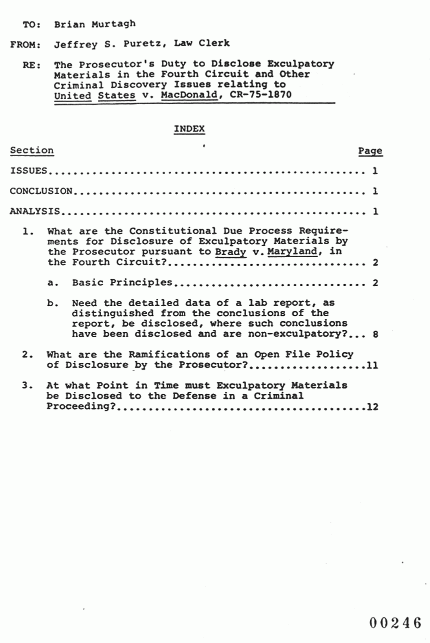 Pre-trial Memorandum from law clerk Jeffrey Puretz to Brian Murtagh, re: The Prosecutor's Duty to Disclose Exculpatory Materials in the Fourth Circuit and Other Criminal Discovery Issues relating to United States v. MacDonald
