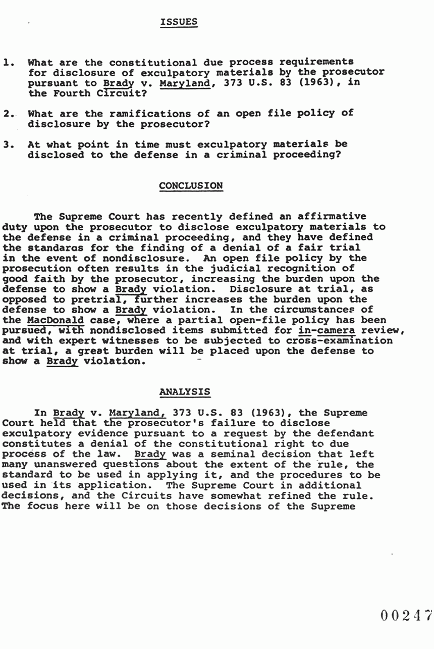 The Supreme Court has recently defined an affirmative duty upon the prosecutor to disclose exculpatory materials to the defense in a criminal proceeding, and they have defined the standards for the finding of a denial of a fair trial in the event of nondisclosure. An open file policy by the prosecution often results in the judicial recognition of good faith by the prosecutor, increasing the burden upon the defense to show a Brady violation. Disclosure at trial, as opposed to pretrial, further increases the burden upon the defense to show a Brady violation. In the circumstances of the MacDonald case, where a partial open-file policy has been pursued, with non-disclosed items submitted for in-camera review, and with expert witnesses to be subjected to cross-examination at trial, a great burden will be placed upon the defense to show a Brady violation.