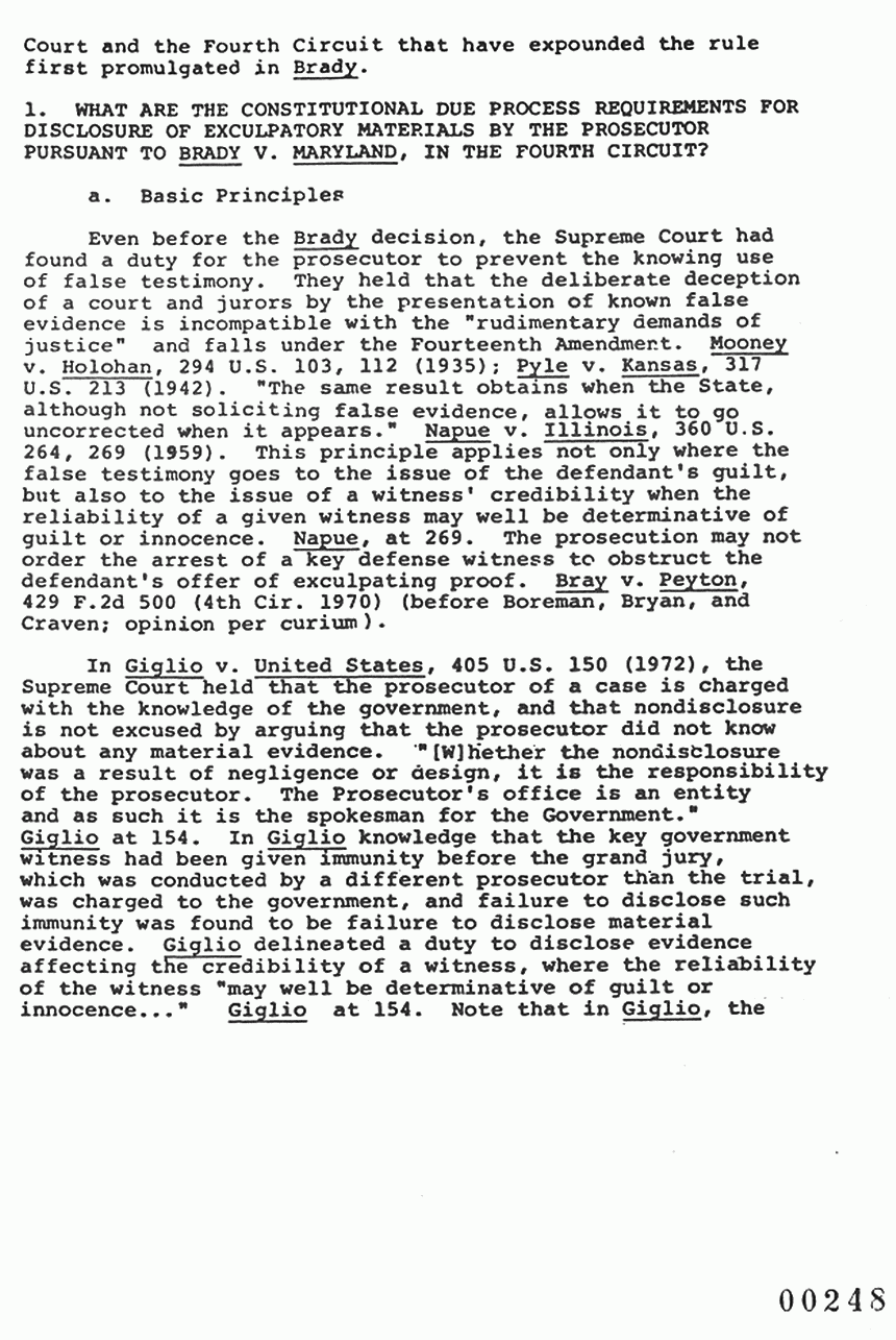 In Brady v. Maryland, 373 U.S. 83 (1963), the Supreme Court held that the prosecutor's failure to disclose exculpatory evidence pursuant to a request by the defendant constitutes a denial of the constitutional right to due process of the law. Brady was a seminal decision that left many unanswered questions about the extent of the rule, the standard to be used in applying it, and the procedures to be used in its application. The Supreme Court in additional decisions, and the Circuits have somewhat refined the rule. The focus here will be on those decisions of the Supreme Court and the Fourth Circuit that have expounded the rule first promulgated in Brady.