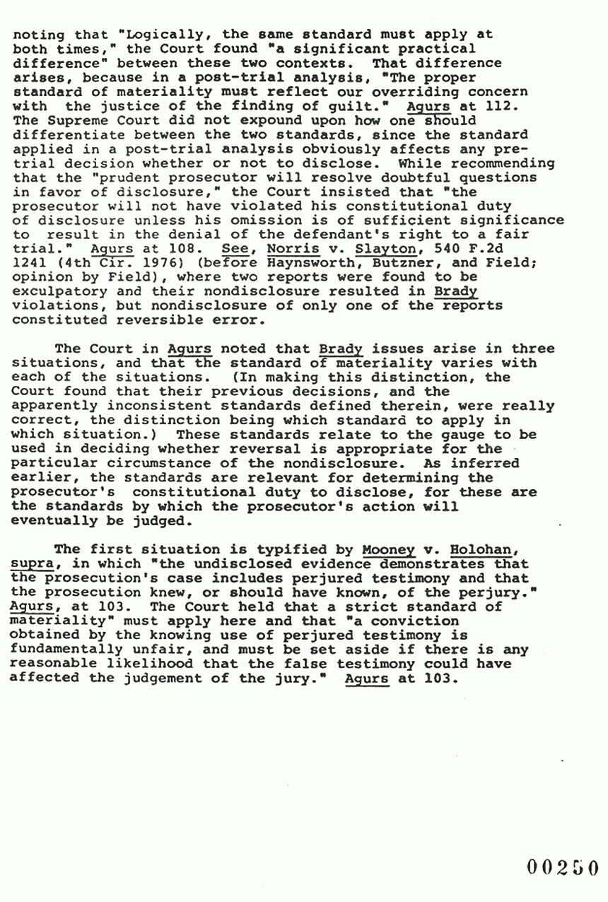 In a recent decision, United States v. Agurs, 427 U.S. 97 (1976), the Supreme Court discussed the Brady standards at length, and articulated the standard of materiality to be applied in determining whether there has been a denial of due process. In defining this standard, the Court recognized that the problem of materiality arises in two contexts, one when the prosecutor makes his decision before trial about what to disclose and the other after the trial when a judge may be required to decide whether a nondisclosure deprived a defendant of his right to a fair trial. While noting that "Logically, the same standard must apply at both times," the Court found "a significant practical difference" between these two contexts. That difference arises, because in a post-trial analysis, "The proper standard of materiality must reflect our overriding concern with the justice of the finding of guilt." Agurs at 112. The Supreme Court did not expound upon how one should differentiate between the two standards, since the standard applied in a post-trial analysis obviously affects any pre-trial decision whether or not to disclose. While recommending that the "prudent prosecutor will resolve doubtful questions in favor of disclosure," the Court insisted that "the prosecutor will not have violated his constitutional duty of disclosure unless his omission is of sufficient significance to result in the denial of the defendant's right to a fair trial." Agurs at 108. See, Norris v. Slayton, 540 F.2d 1241 (4th Cir 1976) (before Haynsworth, Butzner, and Field; opinion by Field), where two reports were found to be exculpatory and their nondisclosure resulted in Brady violations, but nondisclosure of only one of the reports constituted reversible error.