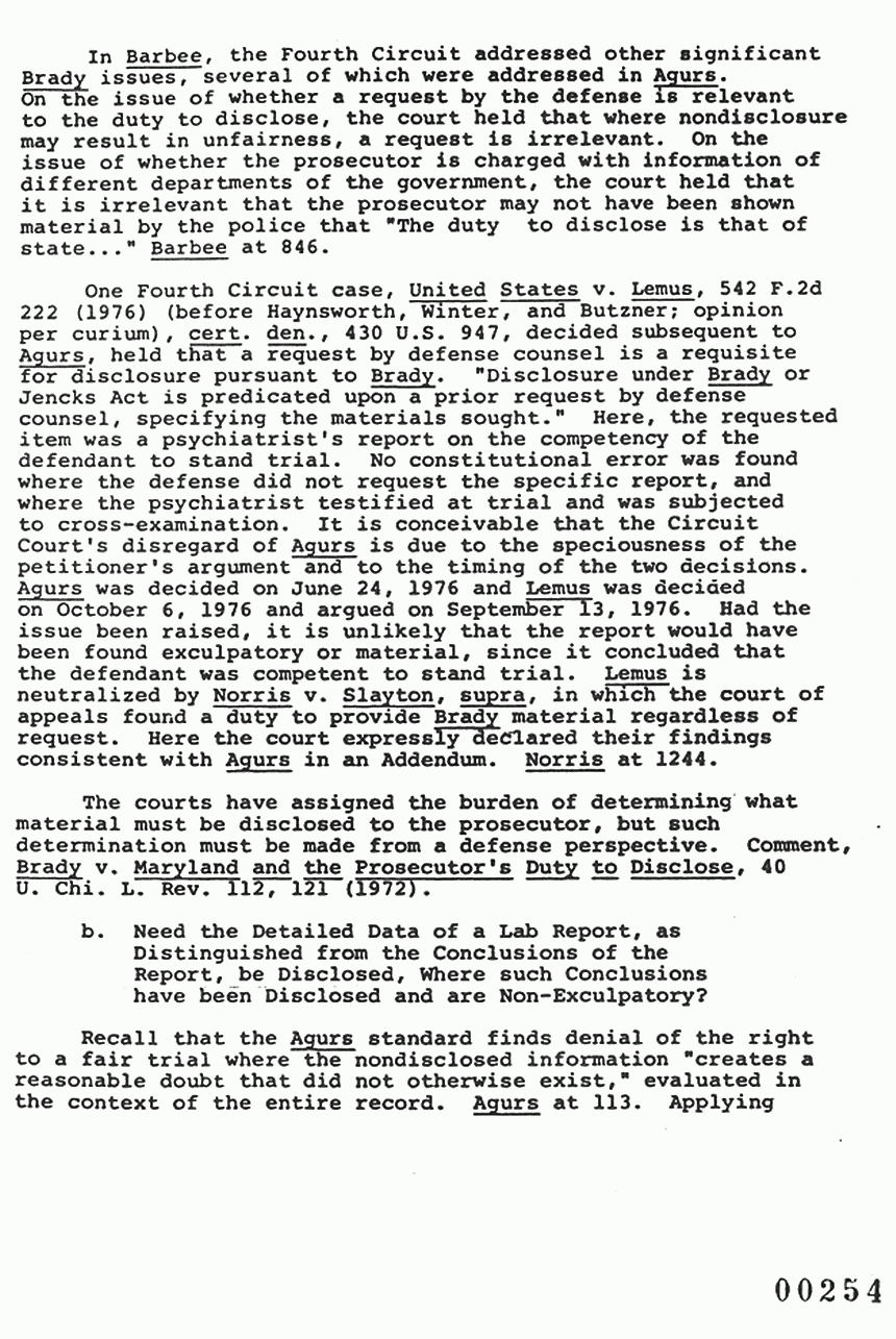 One Fourth Circuit case, United States v. Lemus, 542 F.2d 222 (1976) (before Haynsworth, Winter, and Butzner; opinion per curium), cert. den., 430 U.S. 947, decided subsequent to Agurs, held that a request by defense counsel is a requisite for disclosure pursuant to Brady. "Disclosure under Brady or Jencks Act is predicated upon a prior request by defense counsel, specifying the materials sought." Here, the requested item was a psychiatrist's report on the competency of the defendant to stand trial. No constitutional error was found where the defense did not request the specific report, and where the psychiatrist testified at trial and was subjected to cross-examination. It is conceivable that the Circuit Court's disregard of Agurs is due to the speciousness of the petitioner's argument and to the timing of the two decisions. Agurs was decided on June 24, 1976 and Lemus was decided on October 6, 1976 and argued on September 13, 1976. Had the issue been raised, it is unlikely that the report would have been found exculpatory or material, since it concluded that the defendant was competent to stand trial. Lemus is neutralized by Norris v. Slayton, supra, in which the court of appeals found a duty to provide Brady material regardless of request. Here the court expressly declared their findings consistent with Agurs in an Addendum. Norris at 1244.