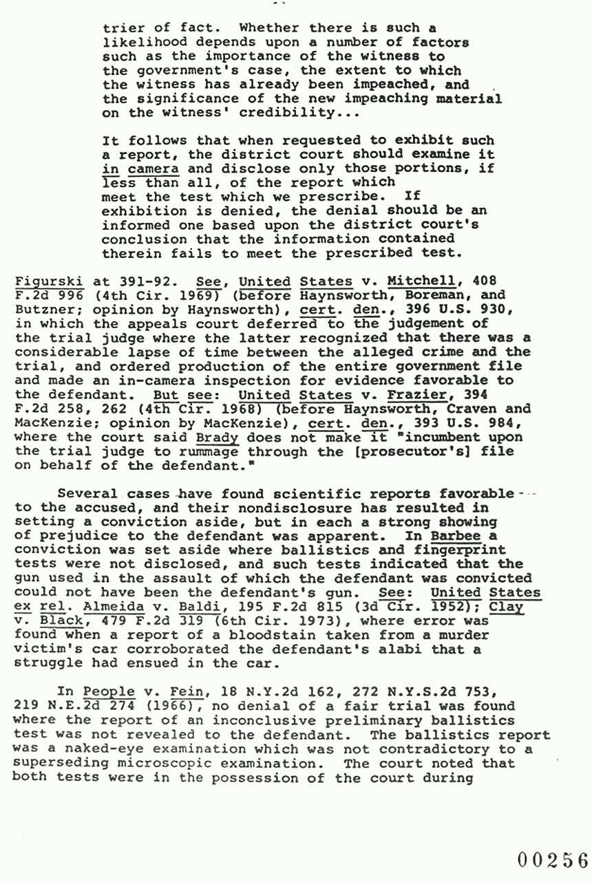 Figurski at 391-92. See, United States v. Mitchell, 408 F.2d 996 (4th Cir. 1969) (before Haynsworth, Boreman, and Butzner; opinion by Haynsworth) , cert. den., 396 U.S. 930, in which the appeals court deferred to the judgment of the trial judge where the latter recognized that there was a considerable lapse of time between the alleged crime and the trial, and ordered production of the entire government file and made an in-camera inspection for evidence favorable to the defendant. But see: United States v. Frazier, 394 F.2d 258, 262 (4th Cir. 1968) (before Haynsworth, Craven and MacKenzie; opinion by MacKenzie), cert. den., 393 U.S. 984, where the court said Brady does not make it "incumbent upon the trial judge to rummage through the [prosecutor's) file on behalf of the defendant."