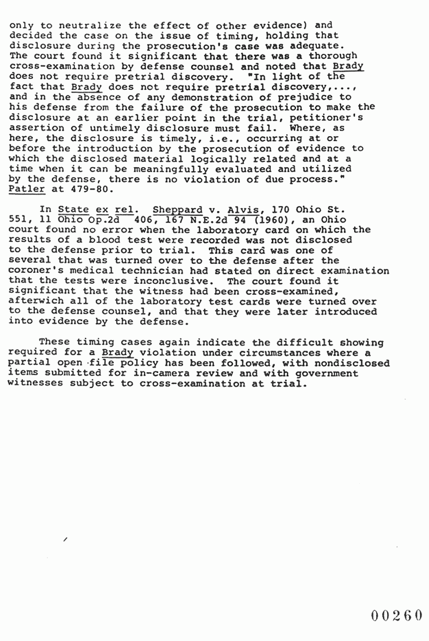 In State ex rel. Sheppard v. Alvis, 170 Ohio St. 551, 11 Ohio op. 2d 167 N.E.2d 94 (1960), an Ohio court found no error when the laboratory card on which the results of a blood test were recorded was not disclosed to the defense prior to trial. This card was one of several that was turned over to the defense after the coroner's medical technician had stated on direct examination that the tests were inconclusive. The court found it significant that the witness had been cross-examined, after which all of the laboratory test cards were turned over to the defense counsel, and that they were later introduced into evidence by the defense.