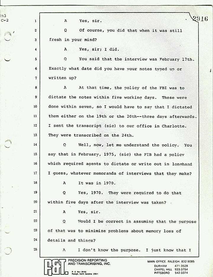 A At that time, the policy of the FBI was to dictate the notes within five working days. These were done within seven, so I would have to say that I dictated them either on the 19th or the 20th -- three days afterwards. I sent the transcript (sic) to our office in Charlotte. They were transcribed on the 24th.