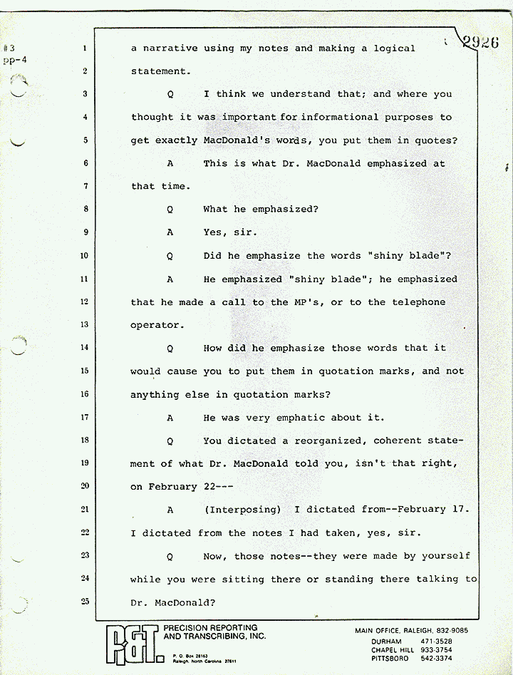 Q Now, one of the very last things you told us this morning just before you were turned over for cross-examination was that you stated from the stand what was actually a paraphrase. You were sort of restating what you have in the last sentence. You said that Dr. MacDonald stated -- this is your statement. You remembered that "He had a lot of blood on himself.'" You remember telling us the same thing this morning; right?