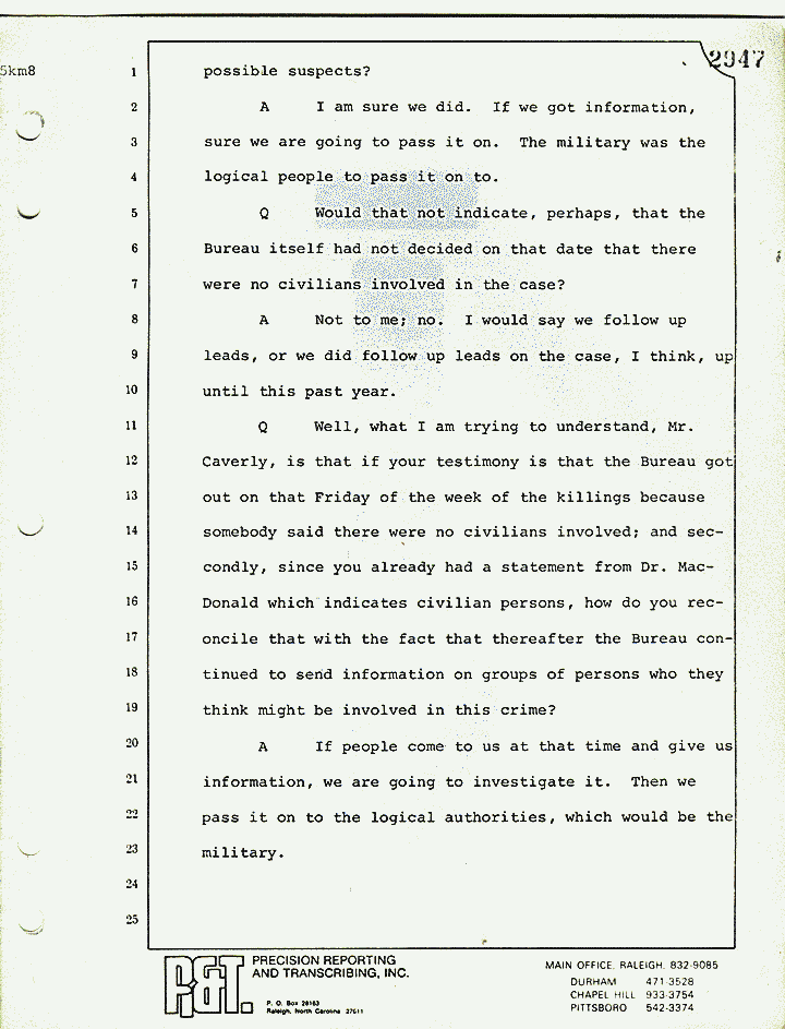 Q Well, what I am trying to understand, Mr. Caverly, is that if your testimony is that the Bureau got out on that Friday of the week of the killings because somebody said there were no civilians involved; and secondly, since you already had a statement from Dr. MacDonald which indicates civilian persons, how do you reconcile that with the fact that thereafter the Bureau continued to send information on groups of persons who they think might be involved in this crime?