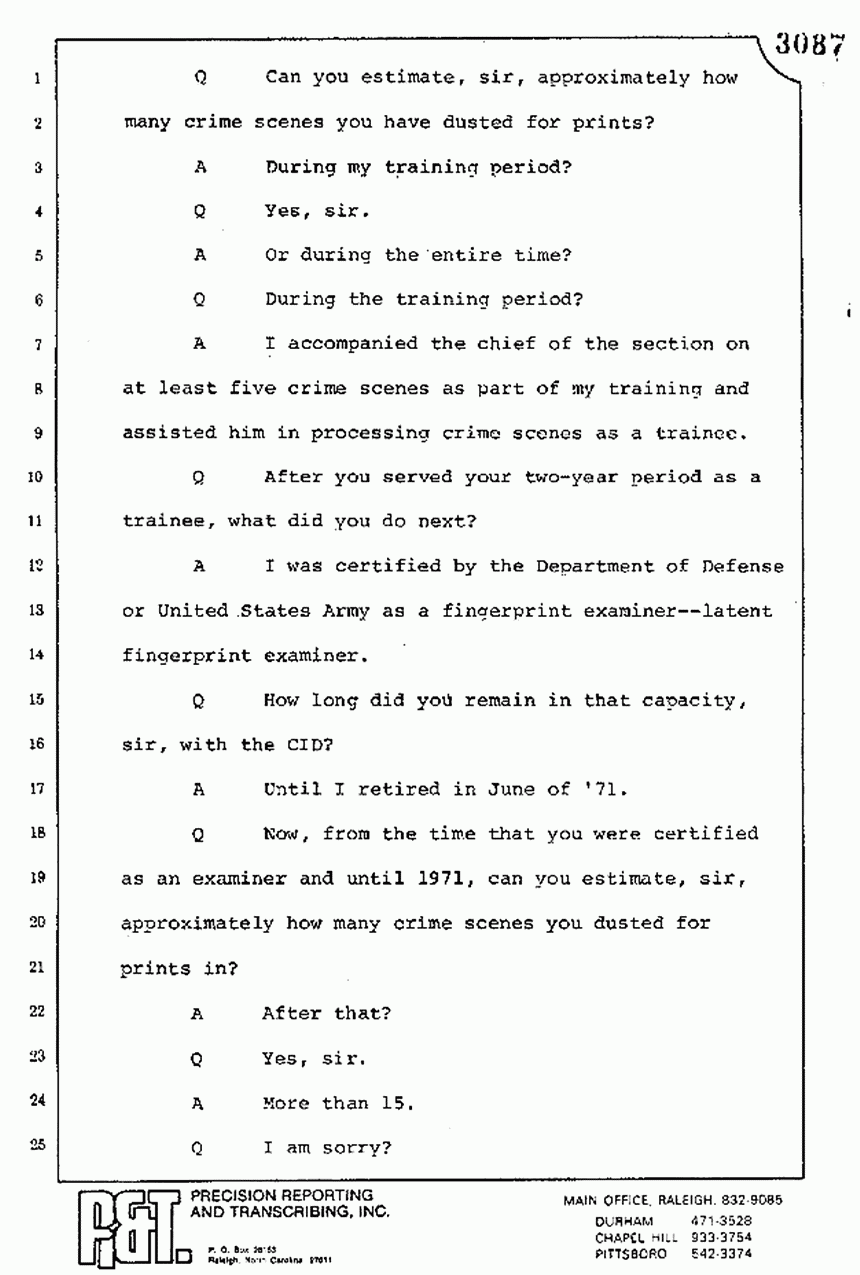 Q Now, from the time that you were certified as an examiner and until 1971, can you estimate, sir, approximately how many crime scenes you dusted for prints in?