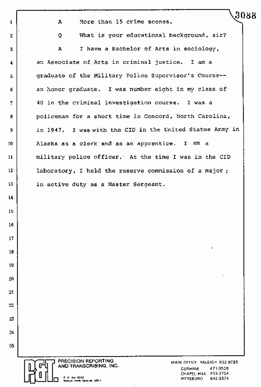 A I have a Bachelor of Arts in sociology, an Associate of Arts in criminal justice. I am a graduate of the Military Police Supervisor's Course -- an honor graduate. I was number eight in my class of 40 in the criminal investigation course. I was a policeman for a short time in Concord, North Carolina, in 1947. I was with the CID in the United States Army in Alaska as a clerk and as an apprentice. I am a military police officer. At the time I was in the CID laboratory, I held the reserve commission of a major; in active duty as a Master Sergeant.