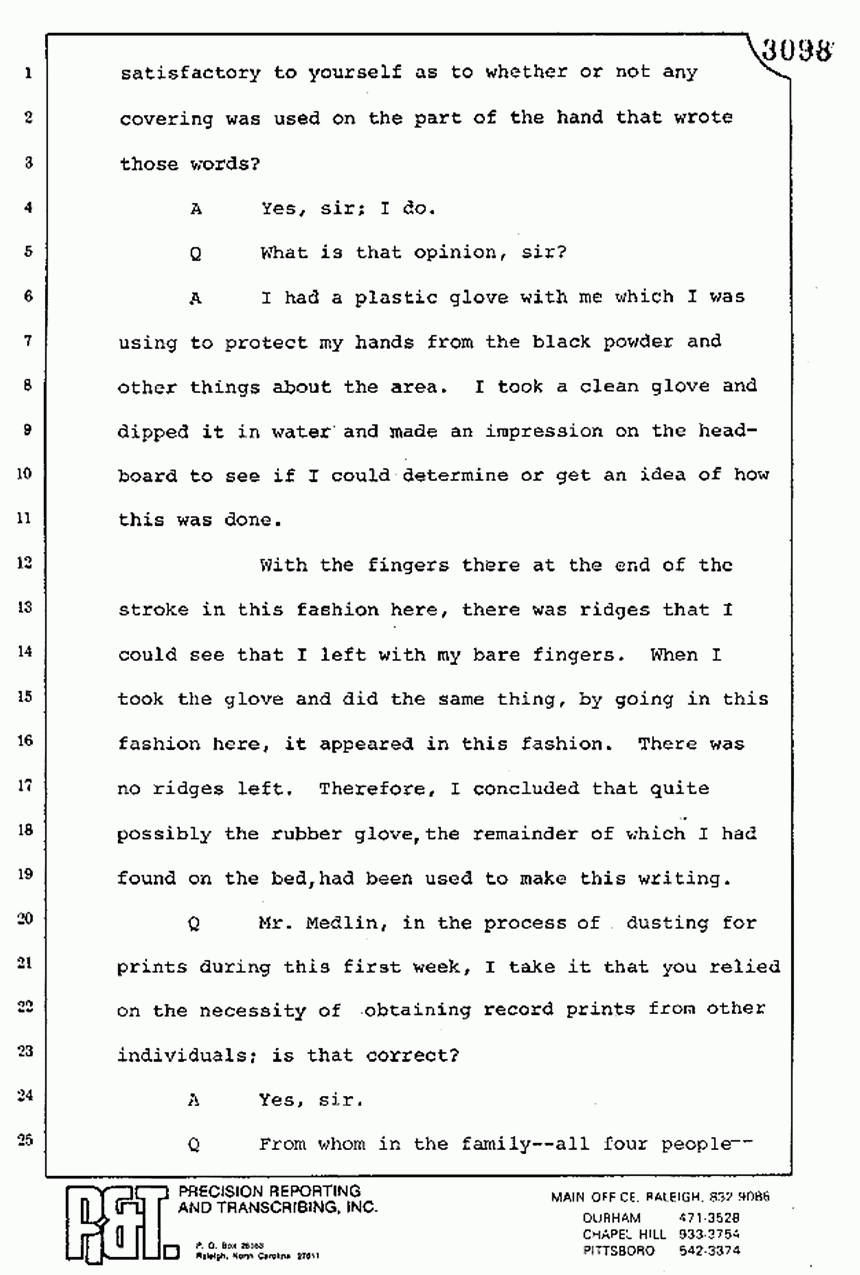 Q Mr. Medlin, explain to us, if you will, sir, after you put -- well in this case, I take it you were unable to lift the prints due to the condition of the wall and jambs and so forth; is that correct?