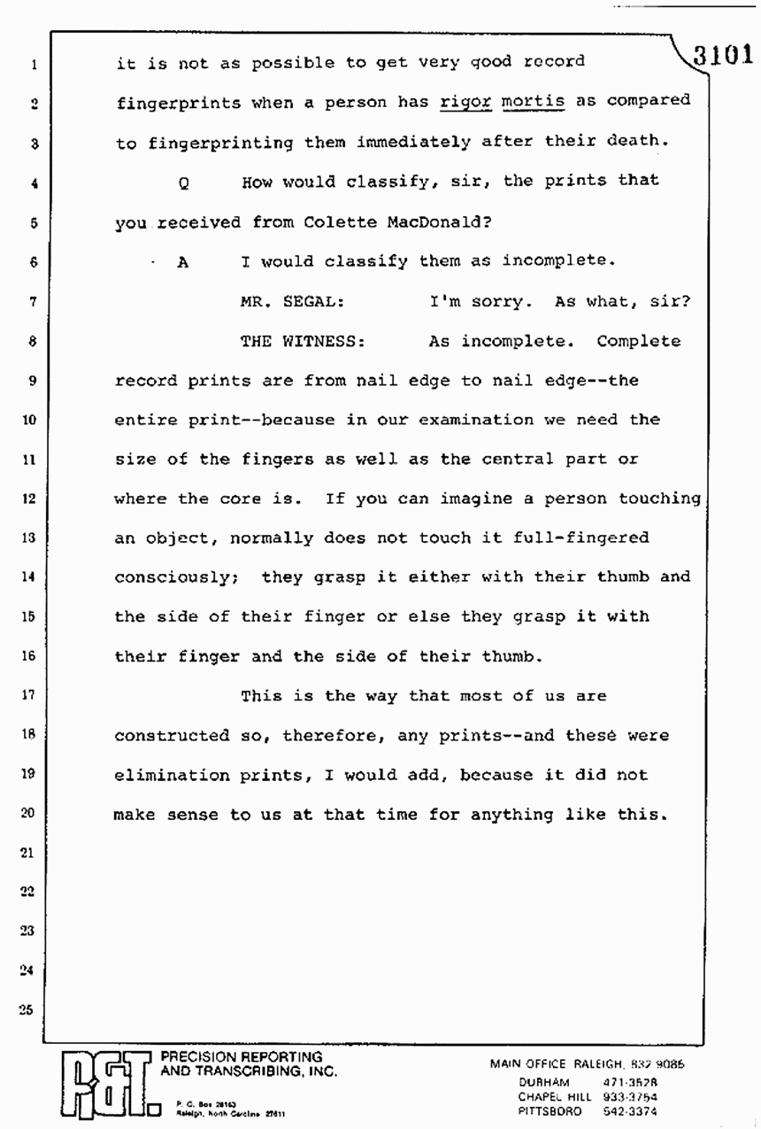 Q Now during the entire time that you were at the MacDonald apartment, how many prints -- finger, palm, and footprints, sir -- did you seek to obtain?