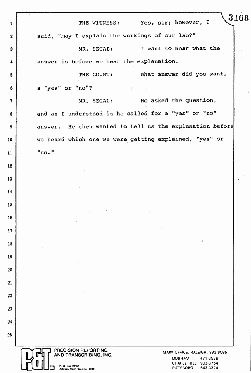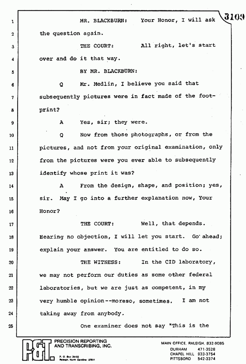 THE WITNESS: In the CID laboratory, we may not perform our duties as some other federal laboratories, but we are just as competent, in my very humble opinion -- moreso, sometimes. I am not taking away from anybody.